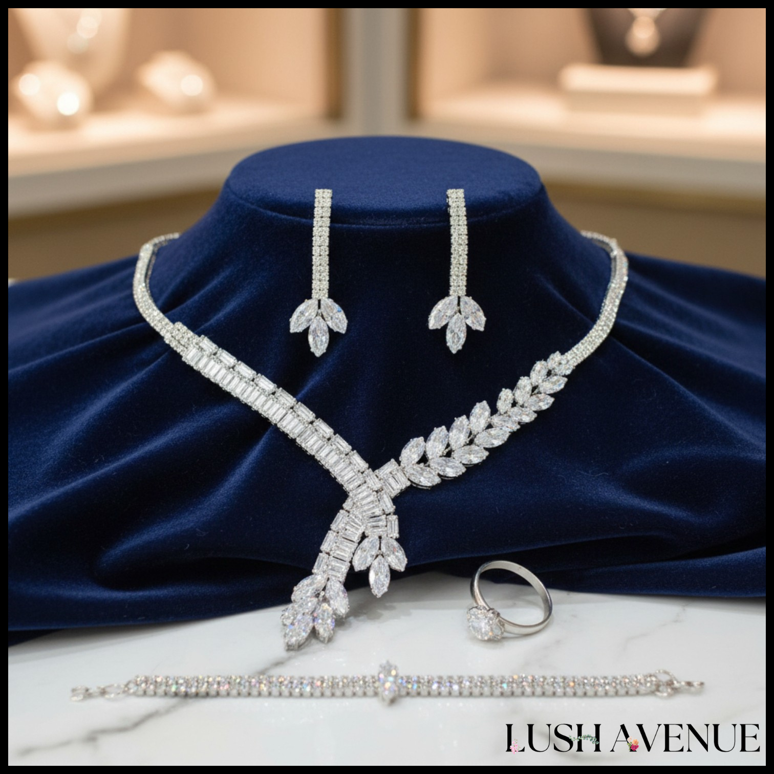 Elegant 4-Piece Jewelry Set – Includes a statement necklace, matching drop earrings, a delicate bracelet, and a solitaire-style ring