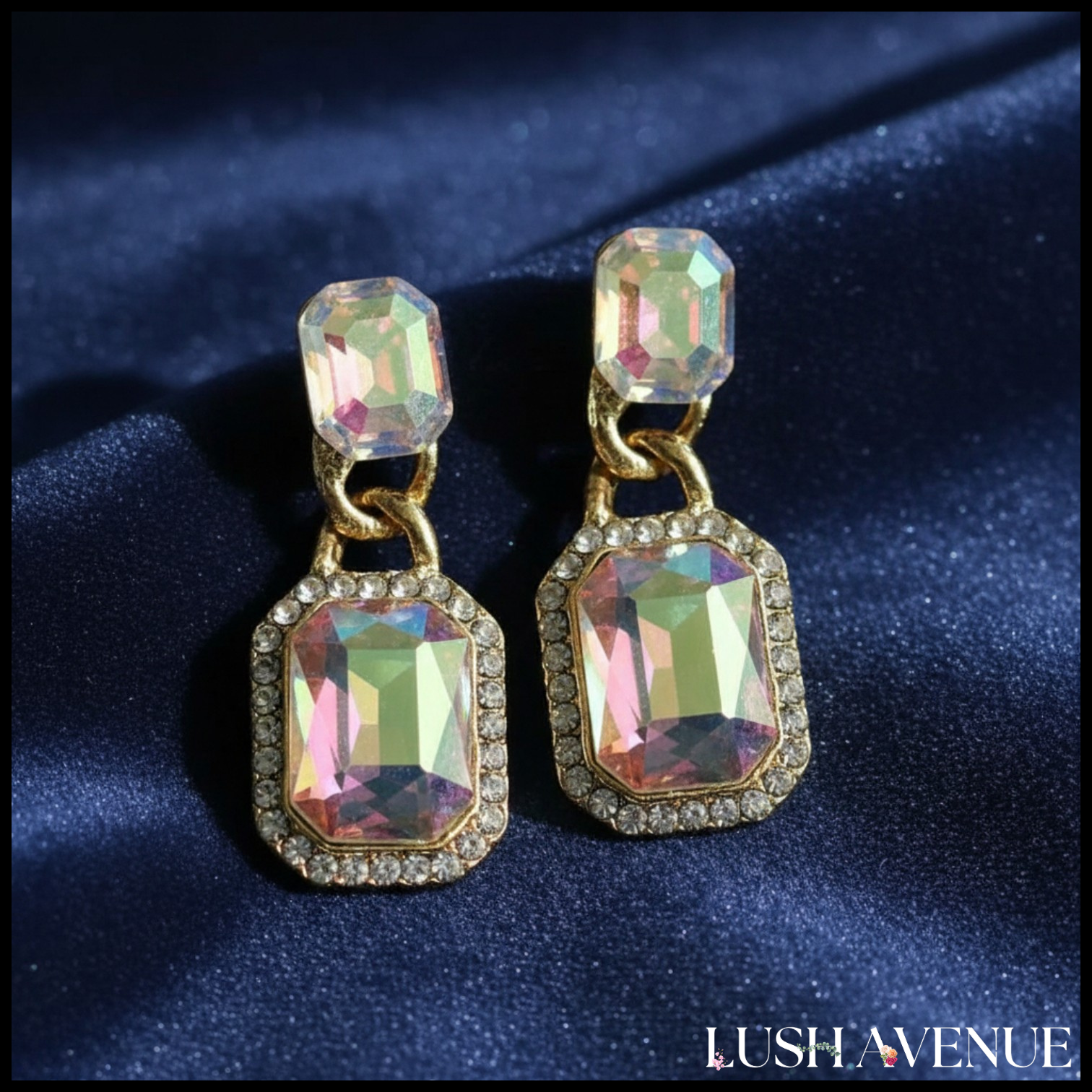 Iridescent, faceted crystals with an aurora borealis finish that reflects soft pink, green, and gold tones